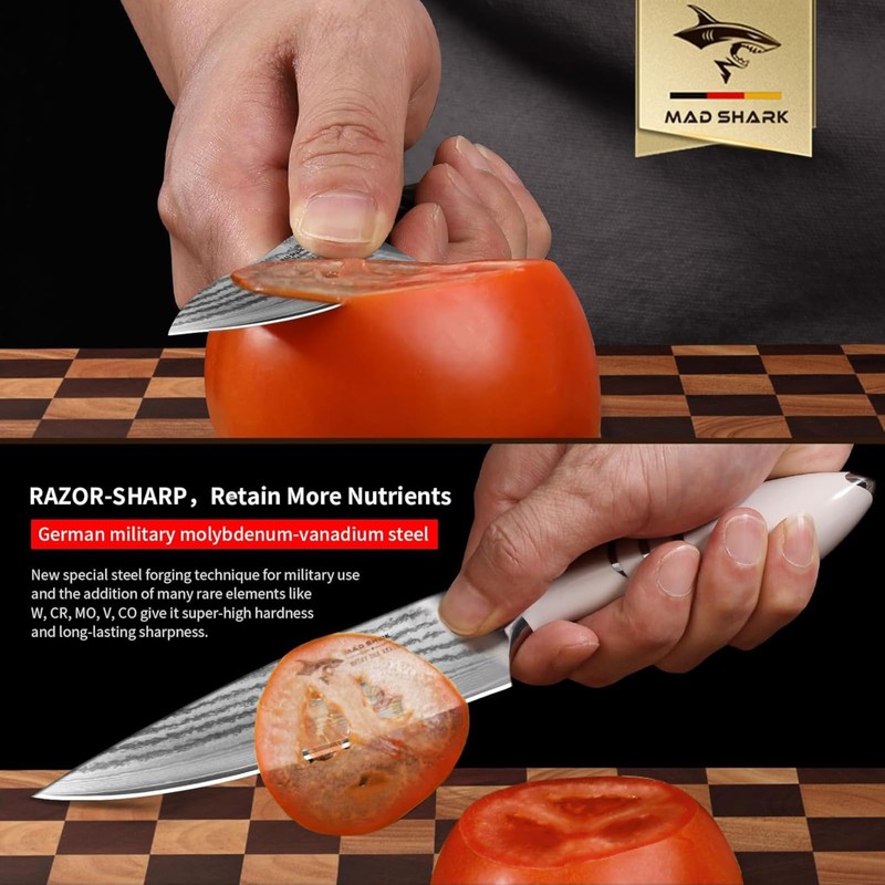Elevate your culinary experience with the MAD SHARK Paring Knife, a versatile 5-inch ultra-sharp kitchen essential designed for precision and ease. Crafted from premium German molybdenum-vanadium stainless steel, this small knife offers exceptional durability and a razor-sharp edge that effortlessly slices, peels, and dices all your favorite fruits and vegetables.