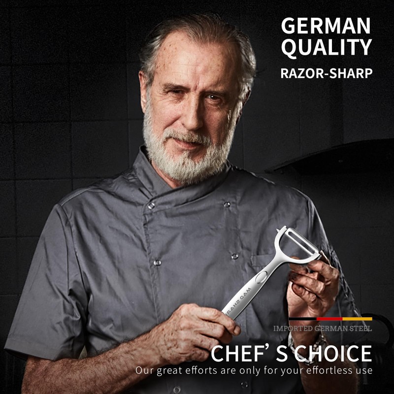 • Super Sharp Potato Peeler The MAD SHARK peeler has an upgraded 304 stainless steel serrated rotary blade and zinc alloy body to ensure rust resistance. Compared to conventional peelers, the blade thickness has been increased to 1 mm, which is twice as thick as conventional blades. The blade and body are reinforced, making the blade sharper, more durable and less prone to falling off.