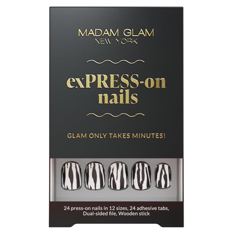 Madam Glam - 24 Press-On Nails in 12 Sizes - Matte Zebra Print - with 24 Adhesive Tabs, Dual-Grit Nail File & Wooden Stick - Quick DIY Nail Application
