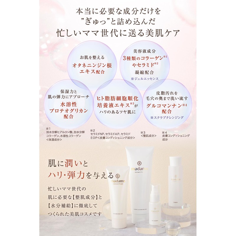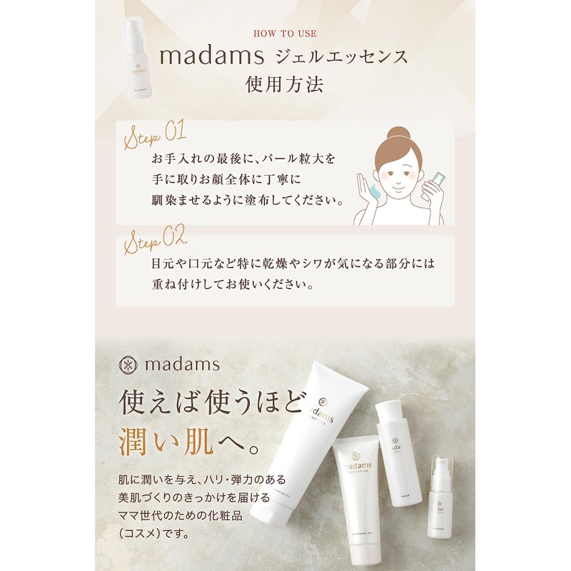 - Madams is the perfect companion to those who are busy with childcare and work. Aging Care: This product contains concentrated serum ingredients such as human fat cells, hyaluronic acid, and 3 types of ceramide. By continuing to use, it will lead to glossy and firm skin. [Beauty Care for Skin] Otaneninroot extract promotes hyaluronic acid production in the skin. Lustrous skin. Formulated with water-soluble proteoglycan to approach moisturizing and skin resilience. Use daily skin care to help you achieve glossy and firm skin. Rose Scent: This product has a luxurious rose scent. It has an elegant floral scent