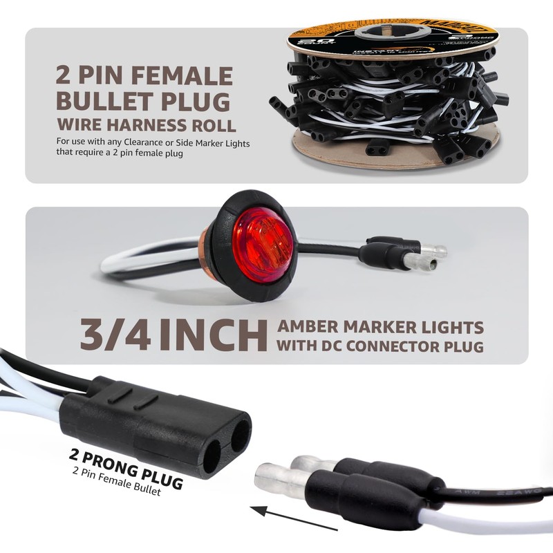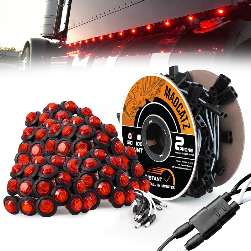 MADCATZ MADCATZ 50 Pcs 3/4" Mini Round Red Side Marker Lights 3LED with Bullet Connector Plug + 2 Prong Wire Harness Roll, 50 Female Plugs - 6.5 inch Lead for Truck Trailer Pickup 12V DC