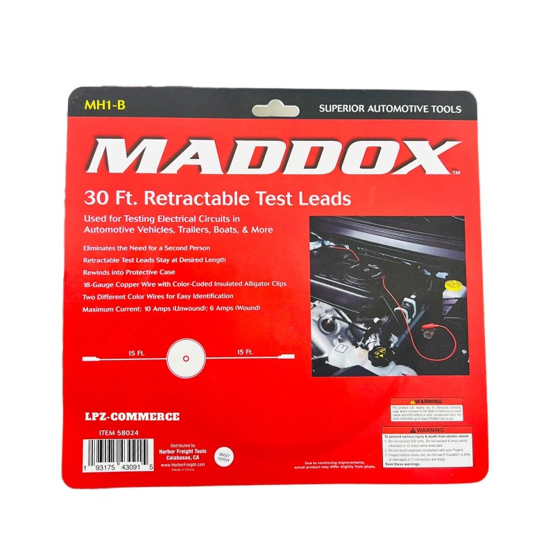 ▪️These MADDOX® 30 ft. retractable test lead offer a heavy duty design making it easier than ever to test circuits on automobiles, trucks, trailers, boats, and more. Eliminates the need for a second person when checking circuits. Handles current up to 6 amps wound and 10 amps unwound.