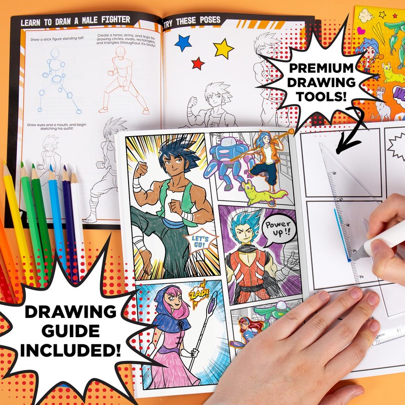 - SET INCLUDES: 8 Colored Pencils (Green, Orange, Purple, White, Yellow, Blue, Teal), 2 Sticker Sheets, 1 Pencil Sharpener, 1 Right-Angle Ruler, 5 Dual-Ended Markers (Black, Blue, Green, Orange, Purple), 1 Storage Carry Case (14.1 in. x 10.63 in. x 1.97 in.), 2 Softcover Comic Books (6.5 in. x 9.5 in., 24 Sheets/48 Pages Each), 1 Drawing Guide (6 in. x 8 in., 20 Pages)