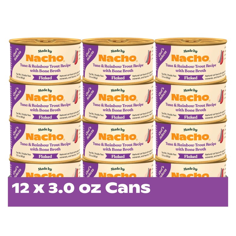 Made by Nacho Chef's Selects Flaked Tuna & Rainbow Trout All Life Stages Wet Cat Food, High Protein, Grain-Free, 3 oz, 12 Count