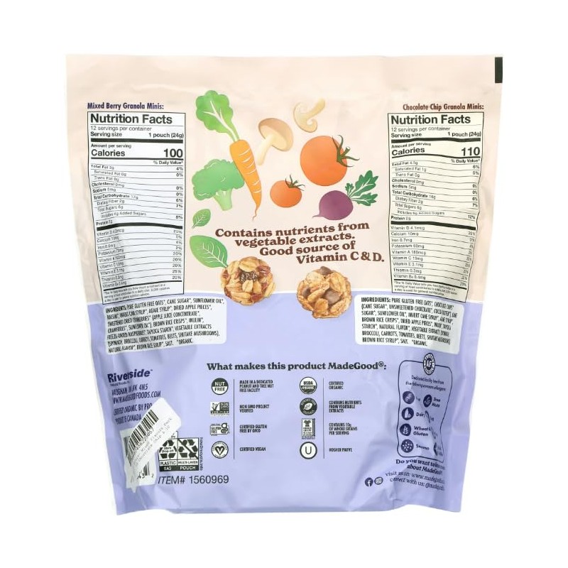 • Variety Pack: 24 pouches with 12 chocolate chip and 12 mixed berry granola mini bites.