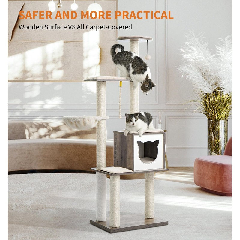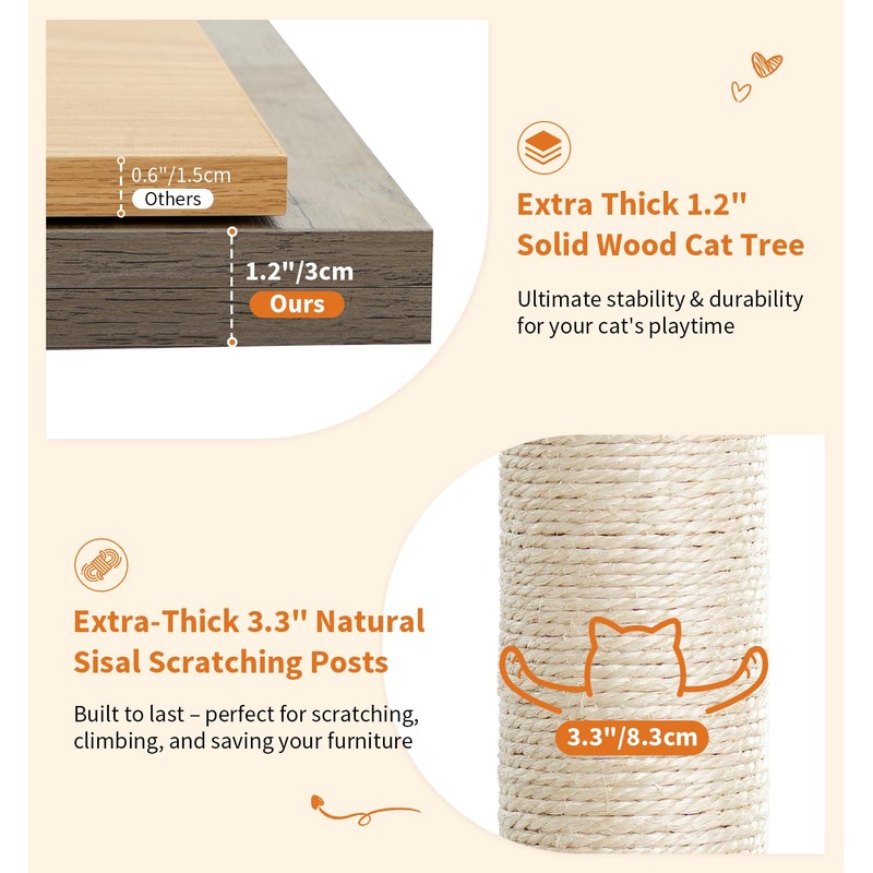 - Superior Stability & Durability—Built with a reinforced wood structure, extra-thick baseboard, and sisal-wrapped posts, this cat tower with scratching post ensures long-lasting strength and balance. An included wall anchor kit adds an extra layer of safety for energetic jumpers and climbers.