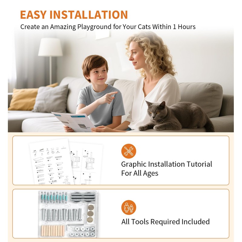 - Easy Assembly, Big Fun—This thoughtfully designed cat tree tower includes clear step-by-step instructions and all required tools, making the setup process simple and stress-free. Once assembled, it becomes a reliable source of daily comfort, fun, and enrichment for your feline companions.