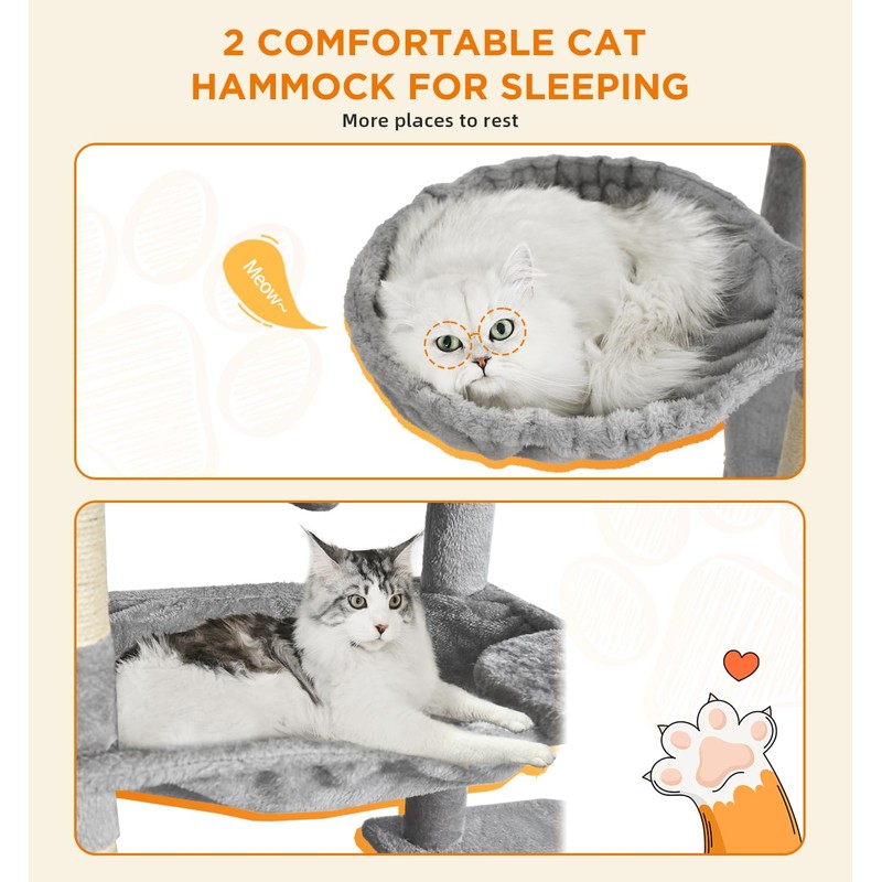 - Large Cat Tree Tower – The Perfect Cat Playground Give your cats a fun, spacious, and cozy place to climb, scratch, and relax! This tall cat tree features five sisal-wrapped cat scratching posts, two plush hammocks, a roomy cat condo, and a high perch, making it the perfect cat tree for indoor cats, large adult or small kittens alike.