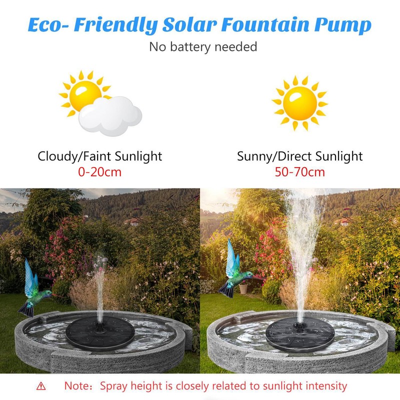 - MUTIPLE APPLICATIONS: Just put in the water, the pump will start to work in 3s once exposed to sufficient sunlight, perfect for bird bath, fish tank, small pond, pool, garden decoration, water circulation for oxygen. (Solar fountains does not store energy, may not work on cloudy days, please make sure the product is used in direct sunlight, and it is recommended to use it in clean water, which will prolong the life of the product).