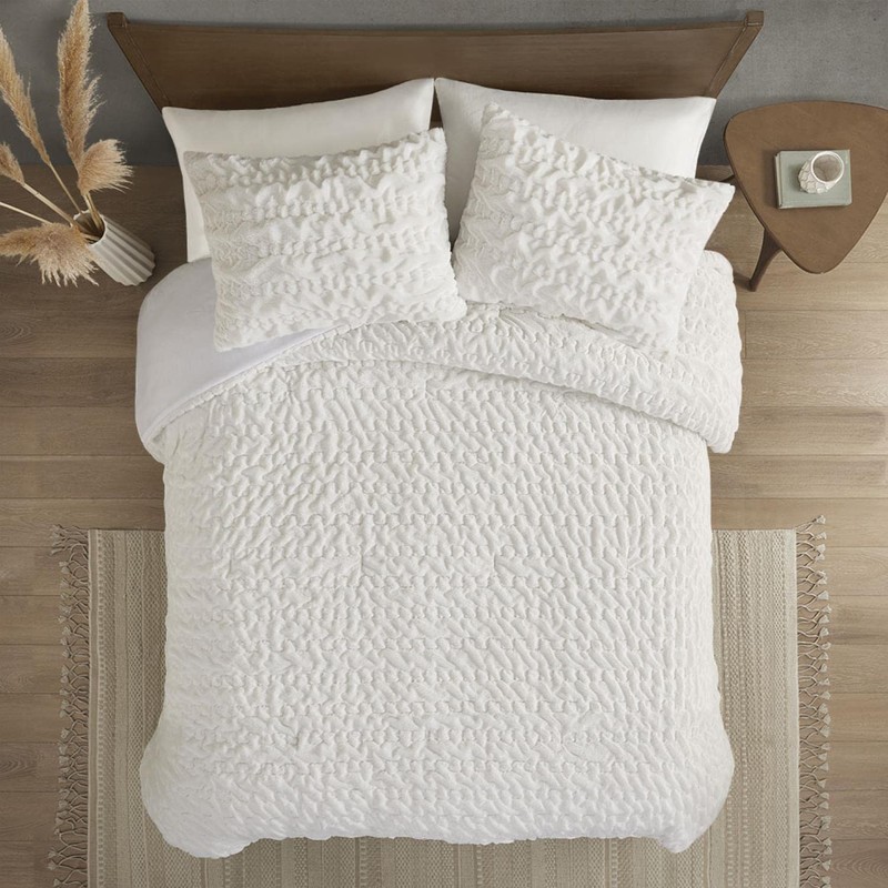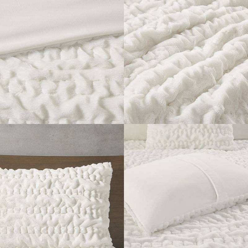 • The Madison Park Blair comforter combines plush faux fur with a stylish ruched design and solid microfiber reverse for year-round luxury. For best results, use "no heat" or "air fluff" on your dryer to remove loose fibers