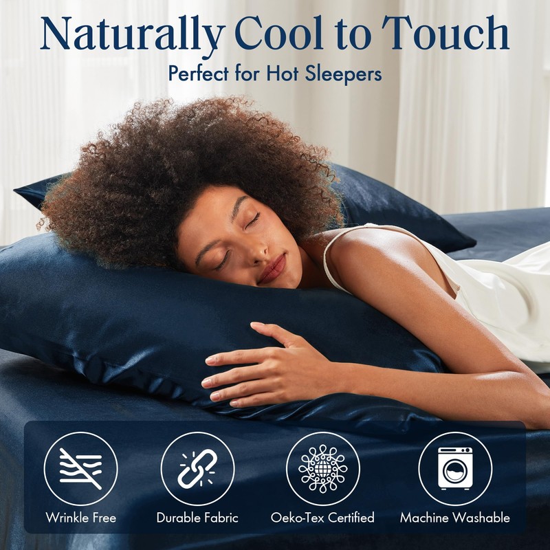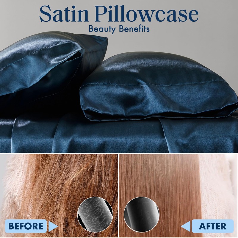 Madison Park Essentials Set of 2 Satin King Pillowcase for Hair & Skin, Luxuriously Soft, Silky with Natural Sheen Luster, Cool to Touch, Wrinkle-Free, Machine Washable, King Midnight Blue 2 Piece