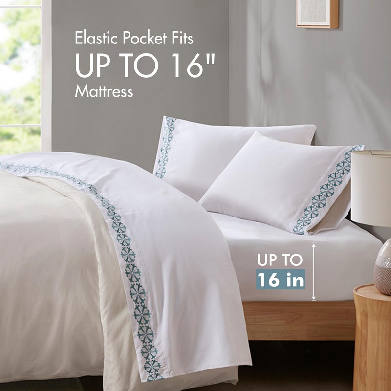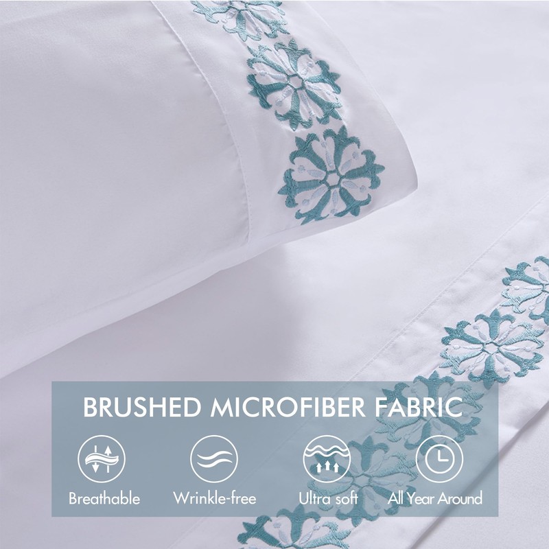 Madison Park Soft Brushed Microfiber Sheets Set, Elegant Embroidery Hem Design, Premium 14" Elastic Pocket Fits up to 16" Mattress, All Season Bedding & Pillowcases, Queen Teal Medallion 4 Piece