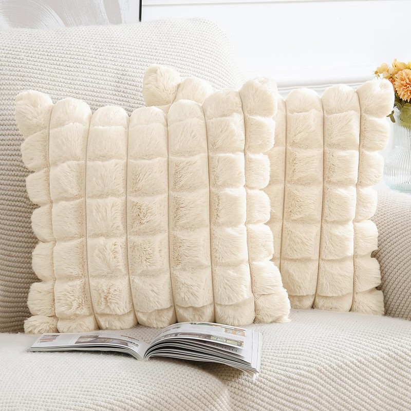 Madizz Set of 2 Faux Fur Plush Decorative Cushion Covers Striped Soft Decorative Cushion Cover for Sofa Bedroom Cushion Shell Beige 45 x 45 cm
