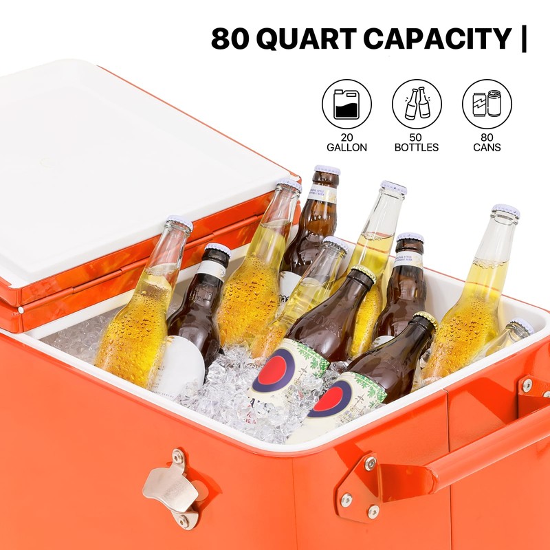 • Large 80-Quart Capacity - Our patio rolling cooler offers plenty of space to store up to 110 12-oz cans or 50 bottles plus extra room for ice. Ideal for large parties and outdoor or indoor activities, such as dinner parties, BBQ, or pool parties.