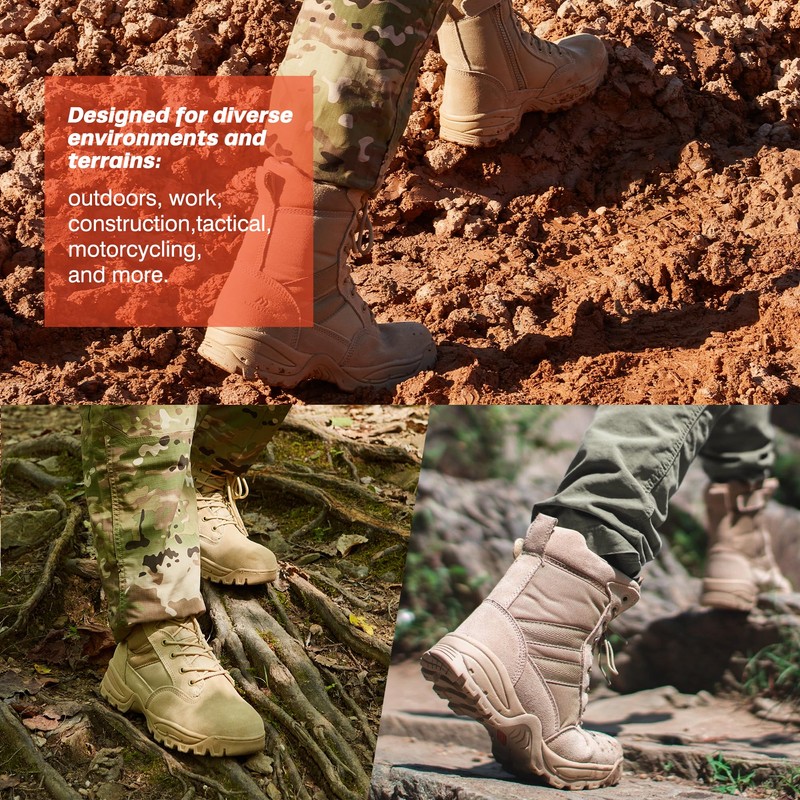 - CONQUER TOUGH CONDITIONS: Our boots are expertly engineered to withstand the harshest environments. Crafted with a breathable suede and an 800D nylon upper, they offer rugged protection and durability. The advanced moisture-wicking lining keeps your feet dry, fresh, and odor-free, while the rugged outsole provides superior traction and support on challenging terrains, ensuring that your every step remains stable and secure.