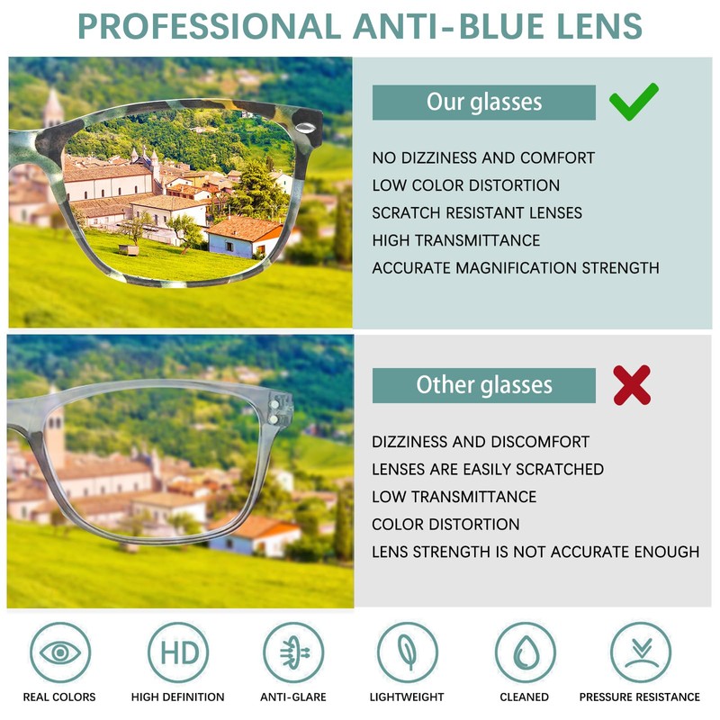 Long-term exposure to harmful blue light will cause headaches. Our blue lights blocking computer reader glasses can block computer glare, reduce headache.
