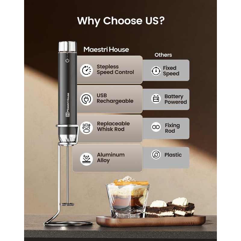 Maestri House Rechargeable Milk Frother with Stepless Speed Control, LunaFro Max Handheld Electric Foam Maker Waterproof Drink Mixer Foamer with Stand & Detachable Whisks for Lattes, Cappuccino