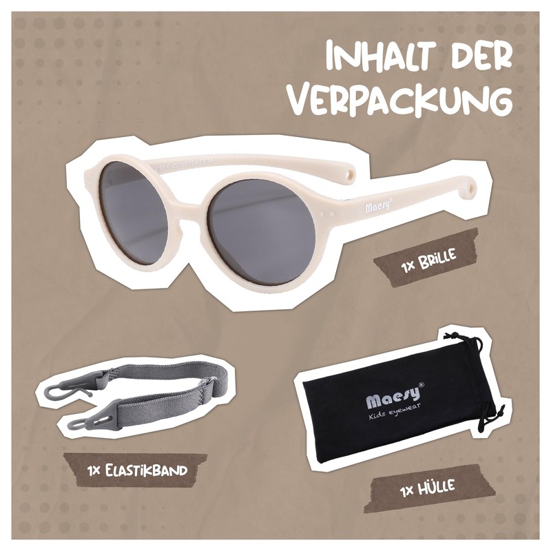 Maesy Baby Sunglasses for 0-2 Years - UV400 Polarised Protection - Flexible and Flexible Frame - Adjustable Elastic Band - Safe and Comfortable Baby Sunglasses - Round - Noah, Beige Ecru