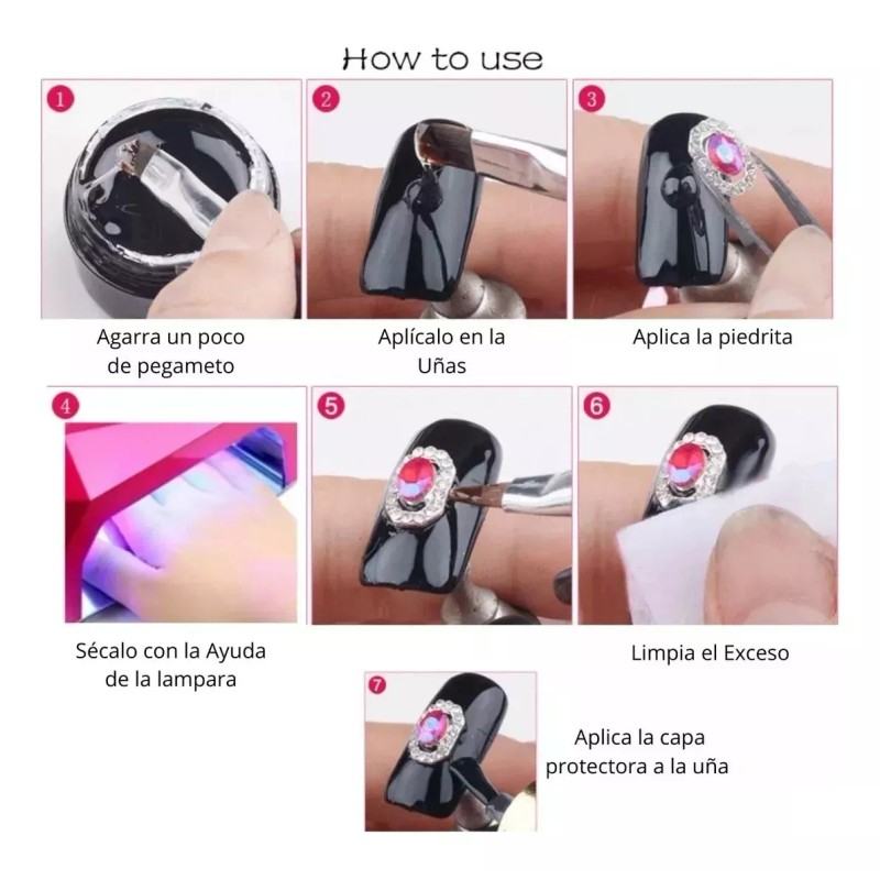 Uso: aplicar un poco de pegamento en la uña, luego poner las decoraciones de uñas en el pegamento, curar para secar con LED.