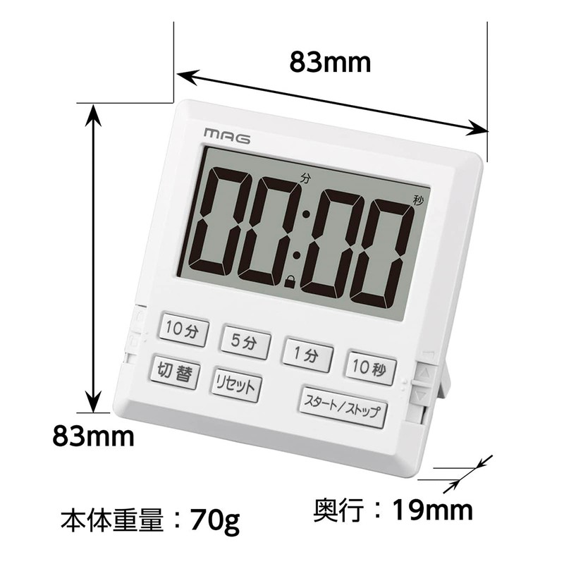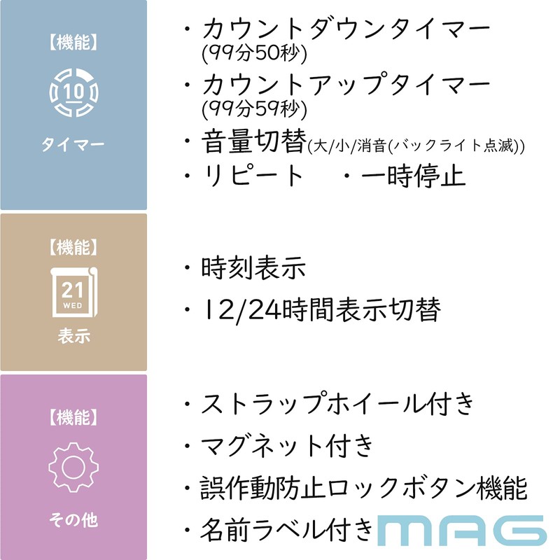 - 機能:カウントダウンタイマー (99分50秒)、カウントアップタイマー (99分59秒)、音量切替 (大・小・消音(バックライト点灯))、一時停止機能、リピート機能、時刻表示、12/24時間表示切替、電子音アラーム、誤作動防止機能、内蔵スタンド、マグネット・ストラップホール付