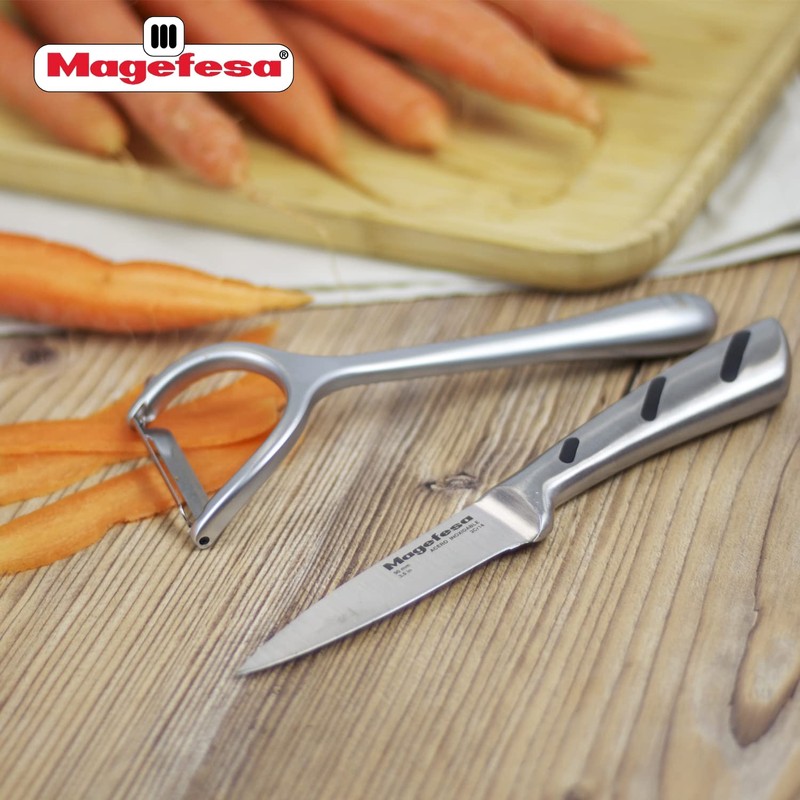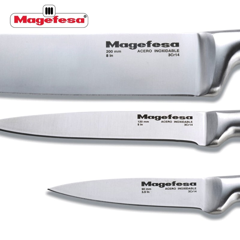 - KNIFE SET: The MAGEFESA PRISMA set includes the three knives in the domestic and professional kitchen: CHEF kitchen knife: 200 mm (8 "), UNIVERSAL knife: 120 mm (5") and PEELER knife: 90 mm (3.5 ").