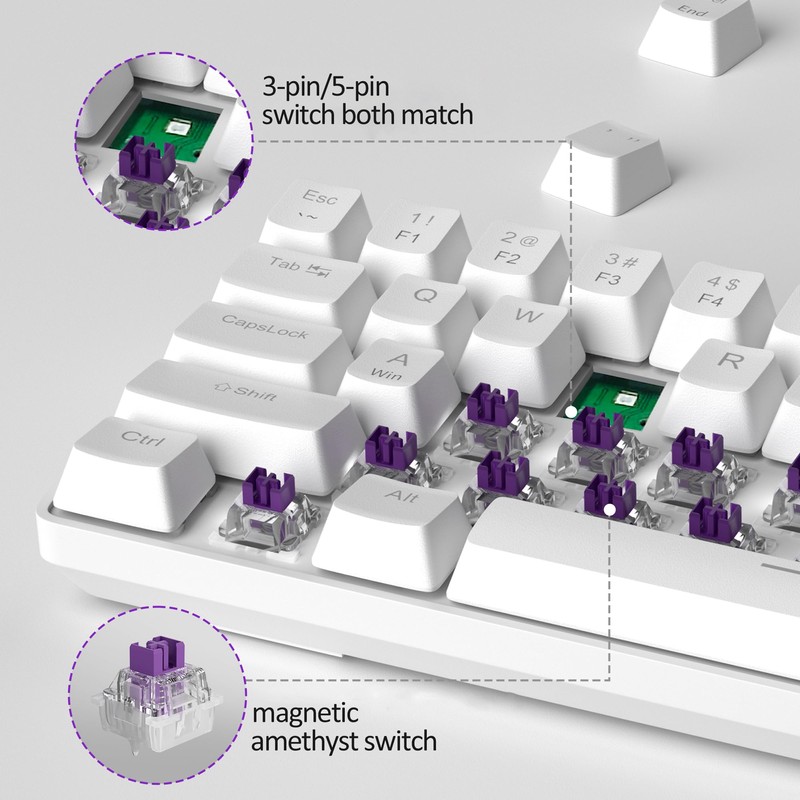 - Rapid Trigger Magnetic Switch Keyboard: unlike traditional mechanical switch, magnetic switchutilize the Hall effect for triggering, with no metal tabs/pins/optics or other sensitive accessories, eliminating physical input delays. With trigger distances ranging from 0.1 mm to 4 mm, adjustable to 0.1 mm accuracy, the keys can be activated and deactivated quickly with minimal physical movement, ensuring that latency is minimized, providing a competitive advantage in fast-paced games.