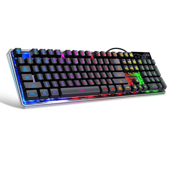 - FANTASTIC RAINBOW LED BACKLIGHT: The gaming keyboard offers gorgeous lighting effects for a more aesthetically pleasing look that allows you to immerse yourself in the game. There are 4 light modes: dim, bright, pulse, and off. Hold down the FN key then press the ESC key to cycle through these options. The light will automatically turn off after 10 minutes of inactivity, press any key to wake up. Perfect for playing games at night, even without the lights on.