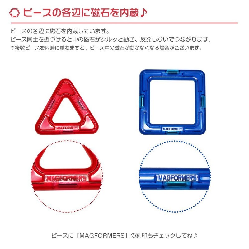 - 平面だけでなく、展開図が一瞬で立体構造に変身する、磁石ならではの簡単でスピーディーな変化も楽しめます。 遊びながら、「図形学習で求められる感覚」=「頭の中で図形をイメージできる能力」を 育てることができるのです。