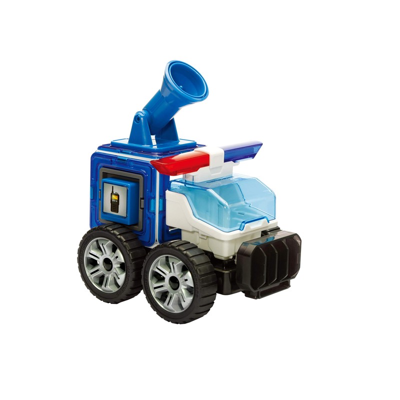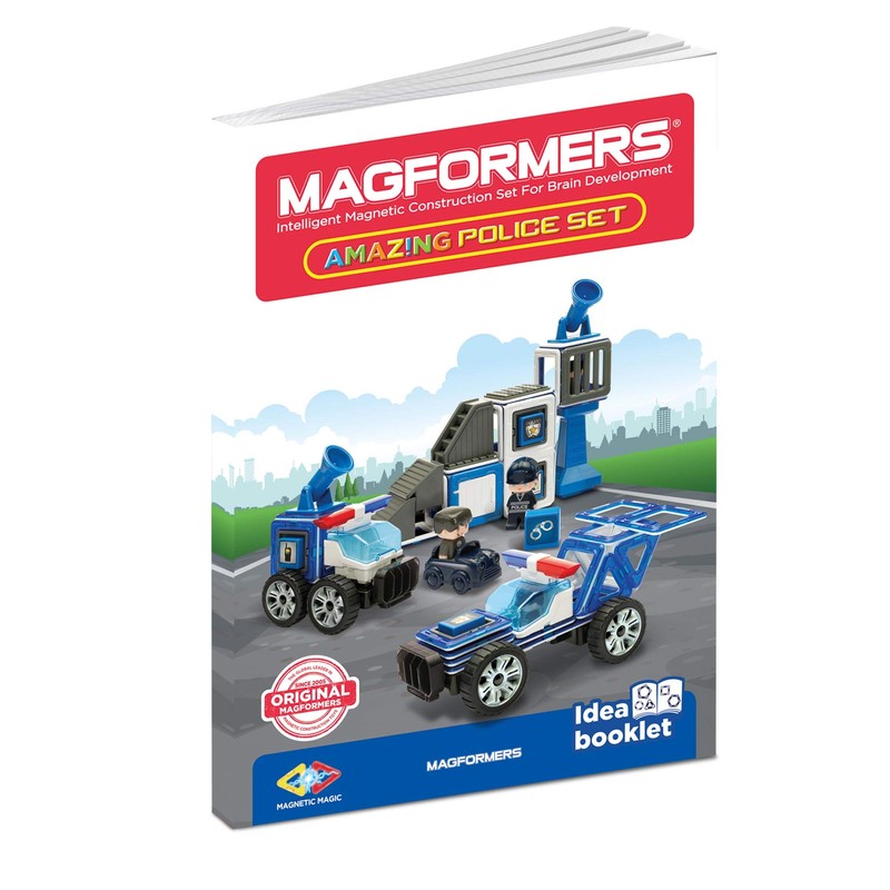 - The original and authentic MAGFORMERS. 8 triangles, 14 squares, 2 rectangles, 2 characters, 24 accessories including, siren, police vehicle, Wheels, accessories.