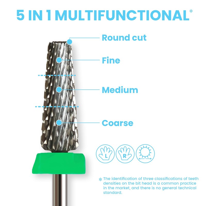 - Safety Bits For Professional Users and Beginners: The design of 5in1 mixed 3 Coarseness with R-cut and teeth on the top brings better work. Two-way rotation is suitable for both left and right-handed. The bit has 16mm grinding head and is designed to handle the working both on long and short nails.