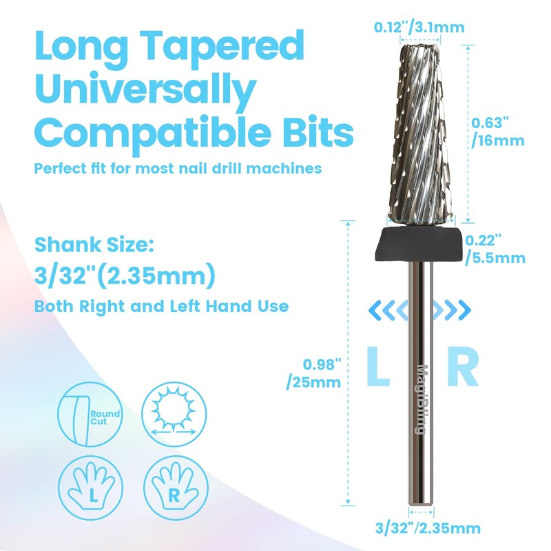 MagiBling 16mm 5 in 1 Tapered Barrel Nail Drill Bits, 3/32'' Safety Tungsten Carbide Bits, Right & Left Rotation, Manicure Cuticle Gel Acrylic Removal Polishing, Technicians Bits, Extra Coarse.