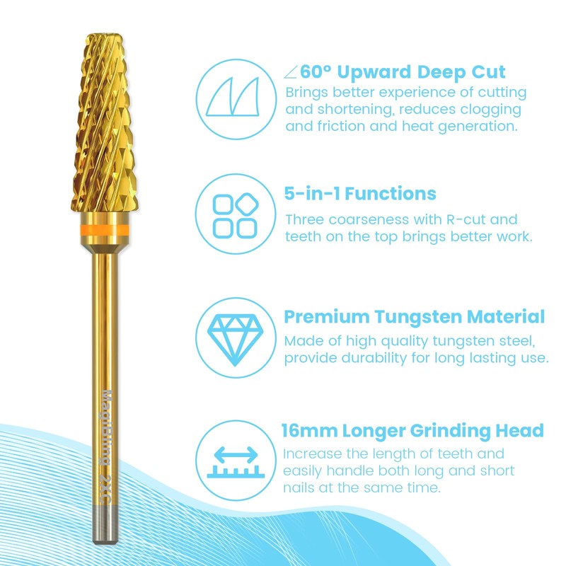 - Quantity: 1 piece | Grit: Double Coarse | Coating: Gold Titanium | Color: Gold | Shank Size: 3/32" | Large Length: 1.77 Inches | Barrel: 0.23 Inches x 0.63 Inches | Design: 5in1 Tapered Barrel Super Cut Nail Drill Bits.