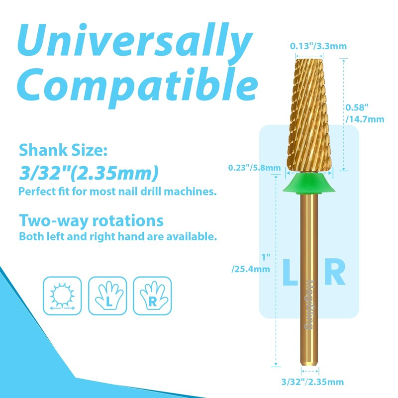 - Professional Bits Fit with Most Nail Drill: 3/32" Shank Bit is suitable for most drill machines. Classic middle size tapered shape has more comfortable angle of dealing small and middle long size nails, adjust the cutting capacity through different parts of grinding head.