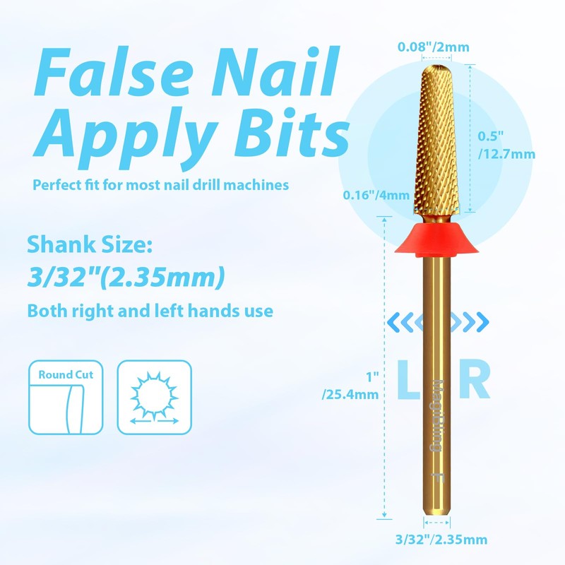 - Safety Bits For False Nail Apply: Small cone tapered bits come with multi-function design, R-cut and teeth on the top. These 2mm top bits are designed to apply false nails, press on nails whatever full cover or half cover.