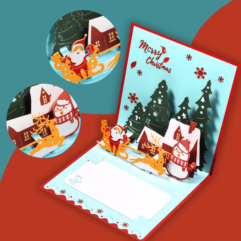 - Captivating 3D Design Experience the magic of Christmas with our intricately designed 3D pop-up card featuring sleigh, reindeer, snowman and a festive Christmas tree.