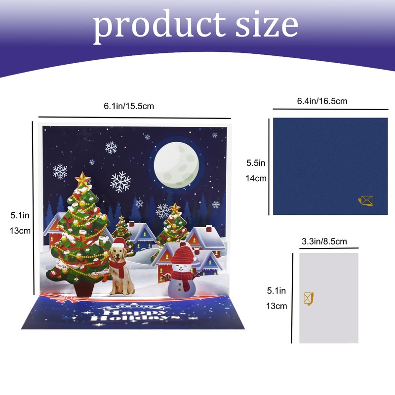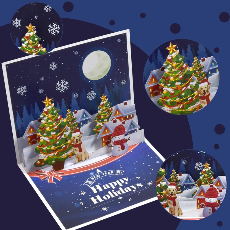 - FESTIVE 3D DESIGN Experience the enchantment of Christmas with our intricately designed pop up card featuring a festive scene featuring a Christmas tree, a playful dog, and a cheerful snowman.