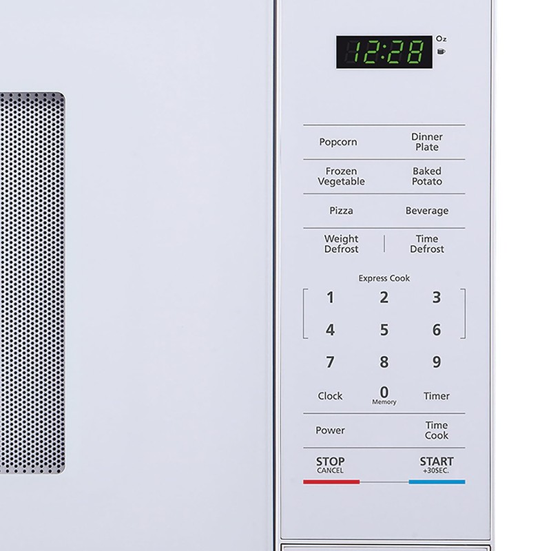 - COUNTER SIZE & EXPRESS COOKING FEATURE: This perfectly sized counter microwave can comfortably fit a full-size dinner plate. It features electronic controls, an LED display screen, a convenient auto-defrost feature, and even a 30-second express cooking function to make reheating quick and easy