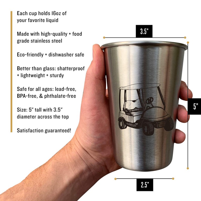 - Stainless Steel Pint Glass: Made from high quality, food grade stainless steel; Graphics include golf clubs, golf cart, golf tee, and driving club; Holds sixteen ounces; Dishwasher safe; Set of four