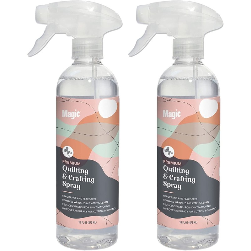 - QUILTING & CRAFTING SPRAY: Magic Premium spray for quilting helps to improve accuracy of cutting, creasing & sewing, while also flattening seams & wrinkles. Our odor eliminating craft spray also has a compressed air trigger for a fine mist spray that won?t clog & is fragrance & flake-free. Product works well with fabric adhesive spray & basting spray for quilting.