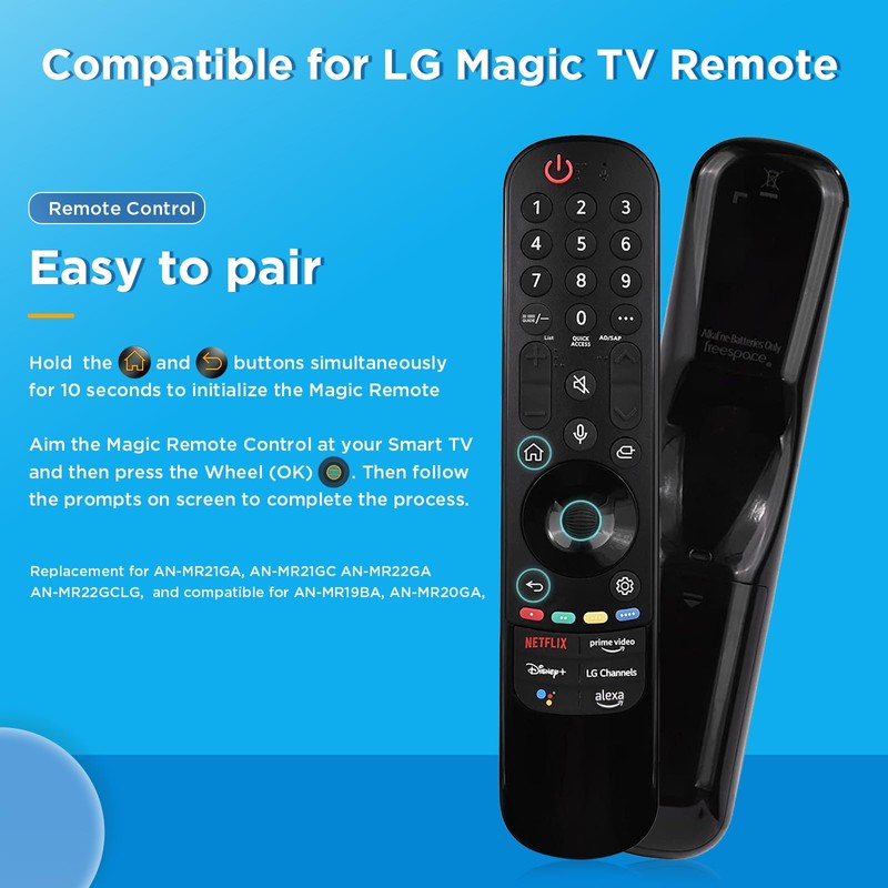 - 🖥【Easy To Pair】Notice: If you don't pair this lg tv remote, you could use most of the remote control's button functions, but you can't use pointer and voice function. Pair Steps: Insert 2*AA 1.5V batteries and press power button to turn on the TV, point the remote toward the TV, then press the Wheel (OK). The remote control will be registered automatically, and the pairing completion message is displayed on the TV screen.