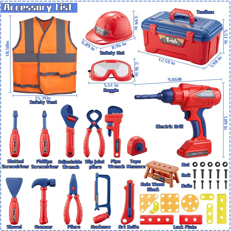 - 【Super Value Toolbox】This toy tools includes 1 safety vest,1 safety hat,1 goggle,1 electric drill,1 slotted screwdriver,1 phillips screwdriver,1 adjustable wrench,1 slip joint pliers,1 pipe wrench,1 tape measure,1 shovel,1 hammer, 1 pliers,1 hacksaw,1 art knife,5 hole wood blocks,9 lock plates,5 nuts,5 bolts,5 nails and 1 toolbox.Everything is fully functional and realistic, your kids will be busy playing various small tools.