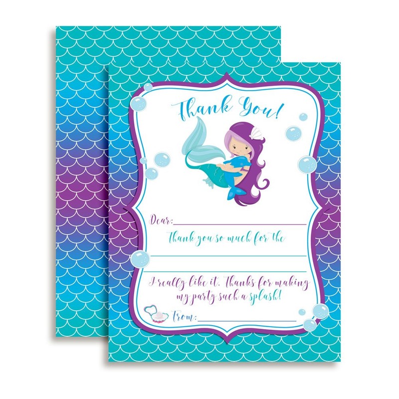 - Cuteness Overload: Designed by a talented mom, these colorful cards feature a beautiful purple haired mermaid swimming and cuddling a dolphin with a fun purple and turquoise scale background. These are a perfect way for kids to write out their own thank you notes for gifts. Amanda Creation. Original design by Amanda Creation