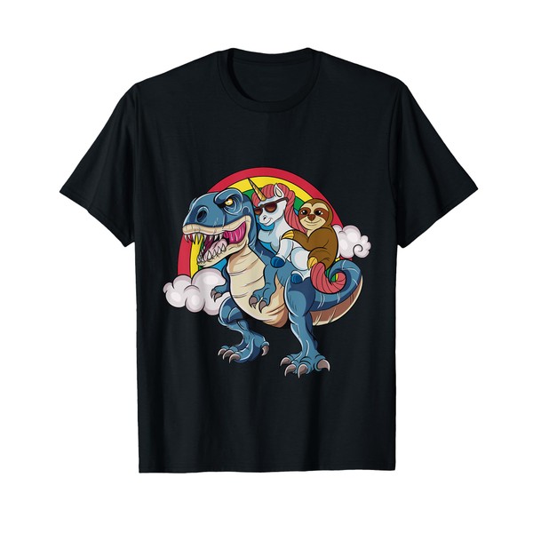 - Magical Unicorn & Sloth Riding A Dinosaur Rainbow T-Shirt makes a funny great gift for anyone who loves majestic unicorns, ravenous Tyrannosaurus Rex dinosaurs, lazy sloths, & pretty rainbows.