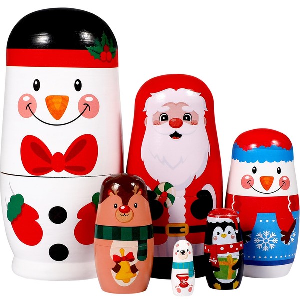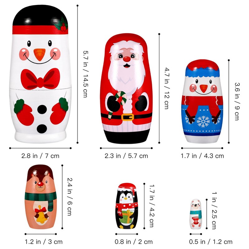 - 🏵️ Package Included: You will get a Christmas themed Russian nesting doll set, which contains 6 cartoon dolls, namely Santa, Penguin, Elk, Snowman, Bear. Dolls of different sizes are nested inside each other. It is easy to store and very fun.