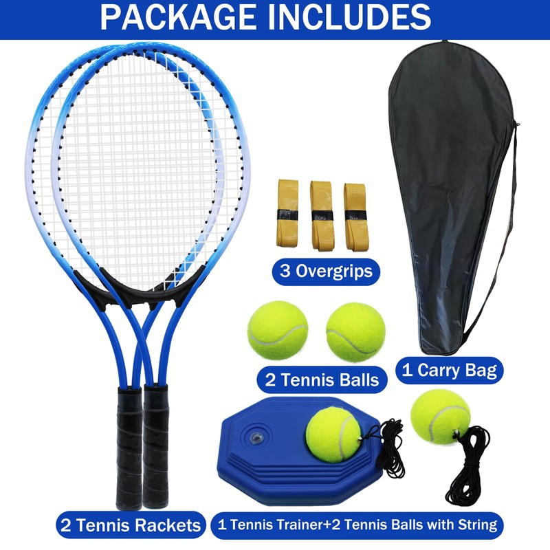 - 【SUPER VALUE 11 in 1 SET】Our Tennis Racquet Set comes with 2x 21" tennis rackets,2xTennis Balls,2xTennis Balls with String ,1xTennis Trainer,3x Handle Grips and 1x Portable Racket Cover,which is suitable for students, lovers, the elderly, starters or intermediate players.