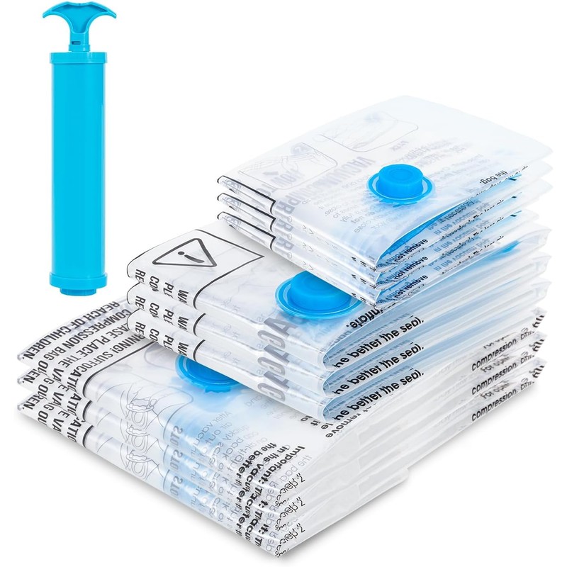 • 6-pack of assorted size vacuum storage compression bags for storing off-season clothes, towels, linens, and more