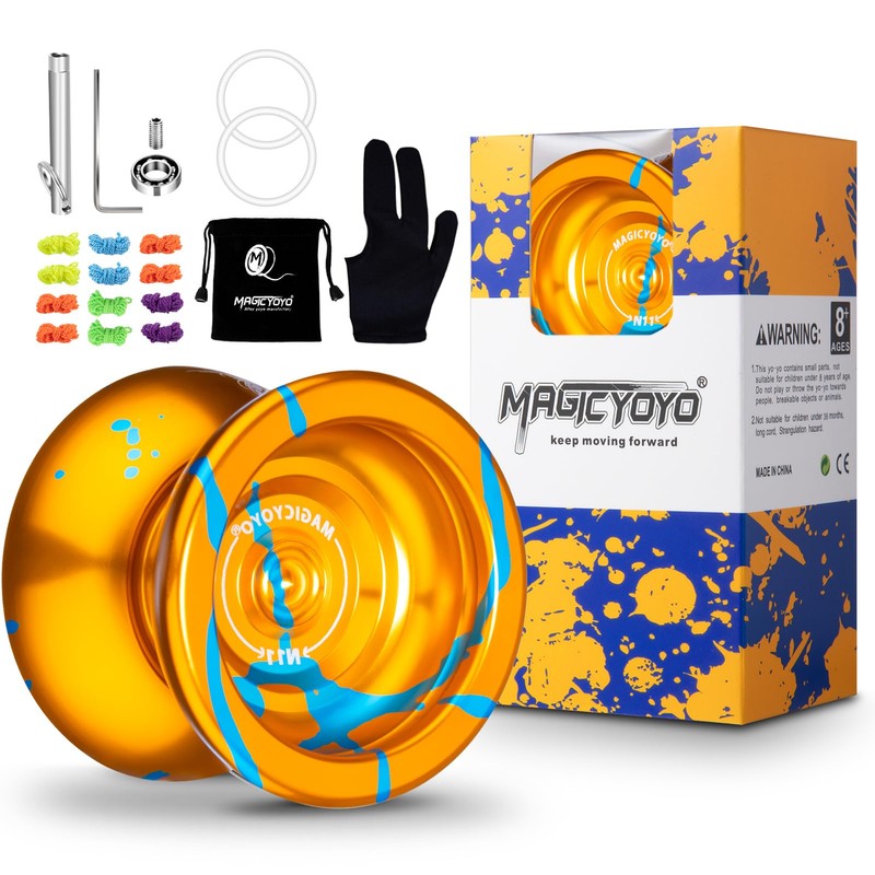 MAGICYOYO N11 Professional Unresponsive Alloy Yoyo Dual Purpose Trick Yo Yo with Responsive Bearing Kit + Bag + Glove +12 Strings - Golden Blue