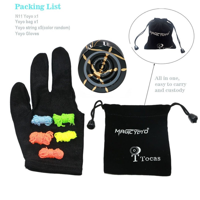 - 4, Present Package-- 1x Yo-yo N11, 5x Yoyo strings, 1x Yo Yo bag (storage all yoyo accessories), 1x Yoyo Glove, 1 x User Manual( in English). Great Birthday, Thanksgiving, Christmas gifts for you, your boys, girls, adults or friends.