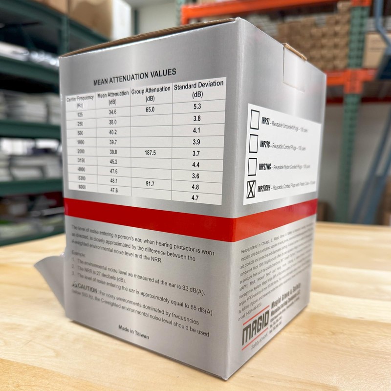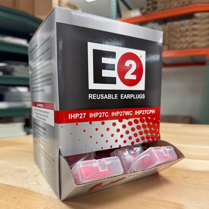 Maggid's E2 Reusable Earplugs with a Hard case combine cost competitive pricing with innovative long lasting features to create the most efficient performing hearing protection available! With an NRR of 27, E2 Reusable Earplugs keep ears safe and sound, use after use. The plug's flexible triple- flange design assures a multi-surface seal across a wide range of ear canal sizes as it conforms to the ear for a custom fit. E2 Reusable Earplugs feature a red, single construction design and are quality crafted using soft, non- irritating PVC for comfortable wear hour after hour. E2 Reusable Earplugs feature a washable design that improves hygiene and extends long term wear by allowing for multiple uses. Their bright red color makes for easy identification during safety checks. Includes a plastic carrying case that can be easily attached to a belt loop for quick access. One pair with hard carrying case individually packaged in sealed poly bag with 50 pairs per dispenser.