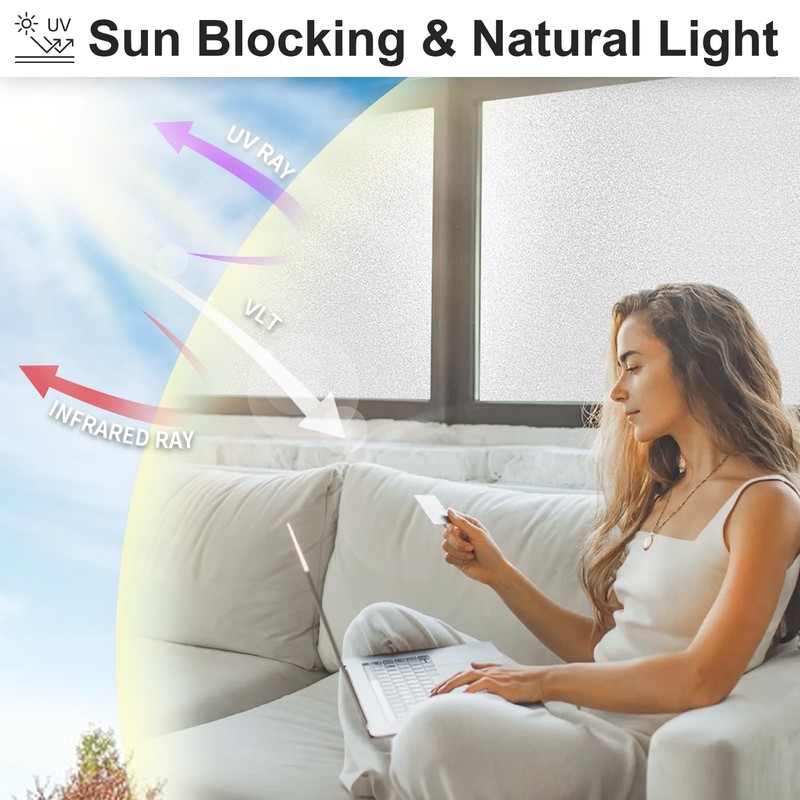 - SUN BLOCKING & HEAT CONTROL:Frosted window clings block 82% of infrared rays and 95% of UV rays, blocking direct sunlight from fading. Heat insulation in summer and heat retention in winter for energy savings and reduction of expensive heating and cooling costs.